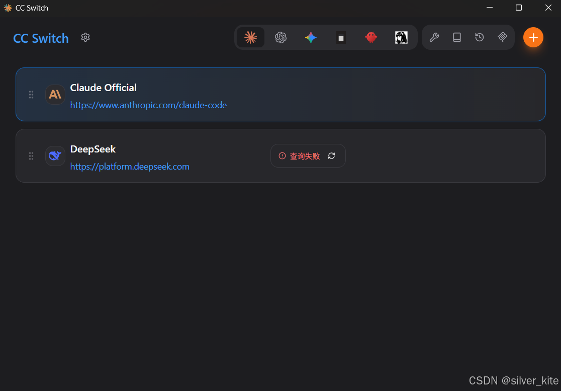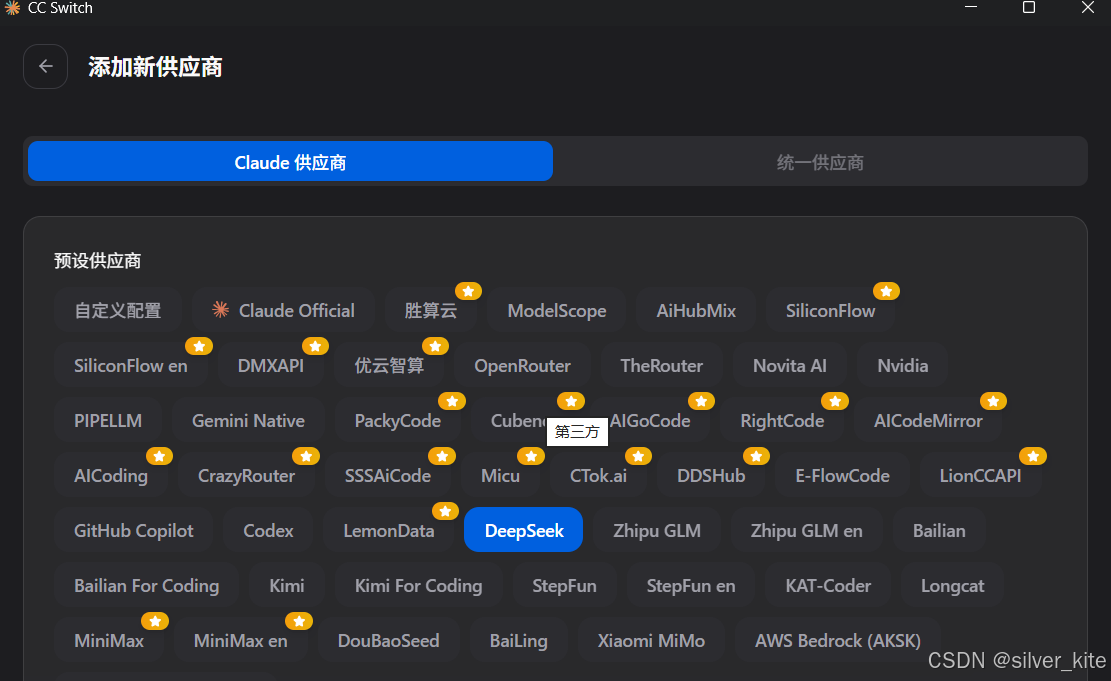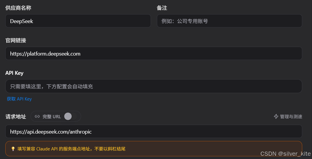 打开CC-switch,供应厂商选deepseek,然后填写之前创建的api-key。
