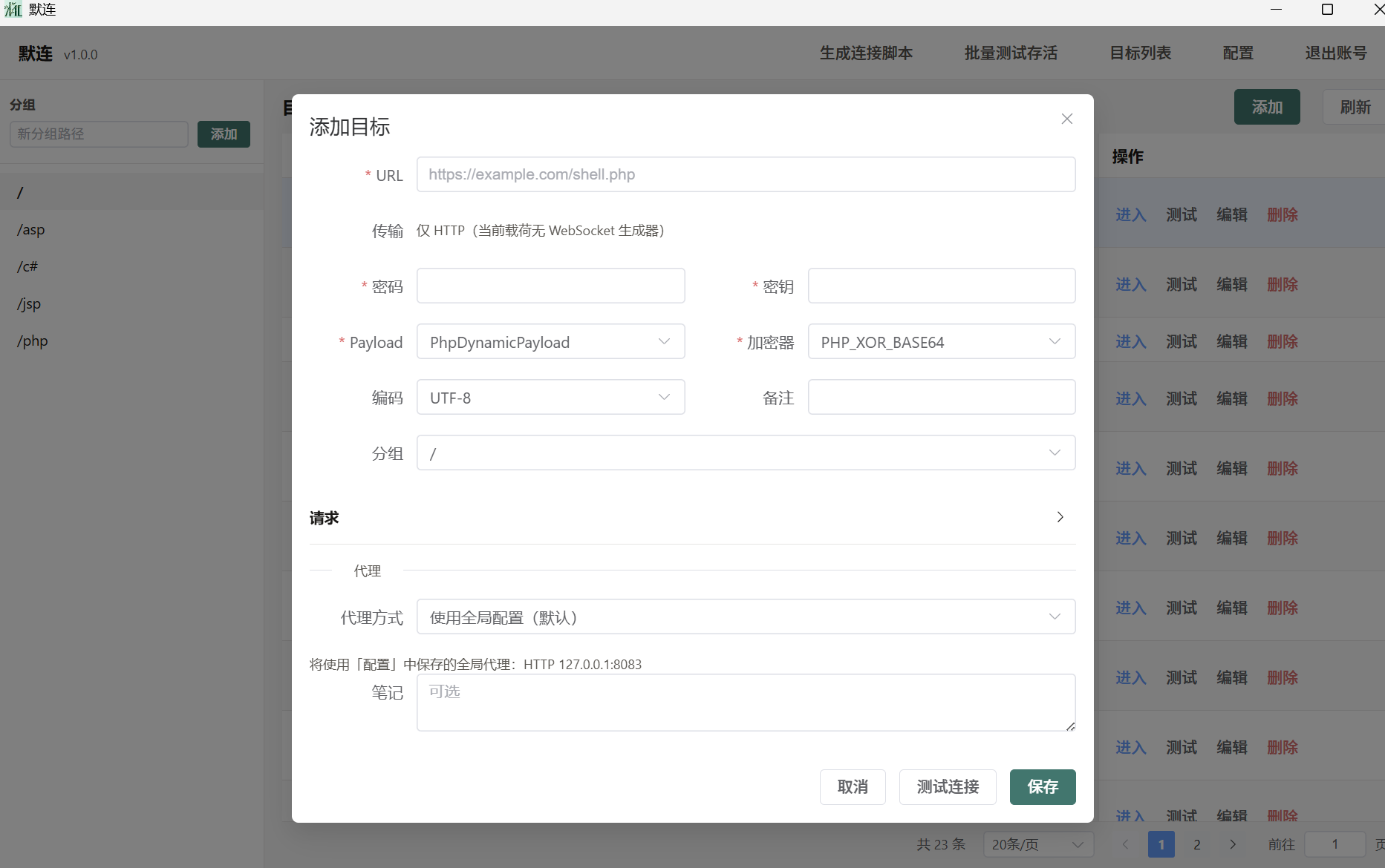 默连,面向 Webshell 的目标管理与远程会话:本地保存配置、连接目标,并在会话中提供文件、命令、数据库及 Godzilla 兼容插件等能力。