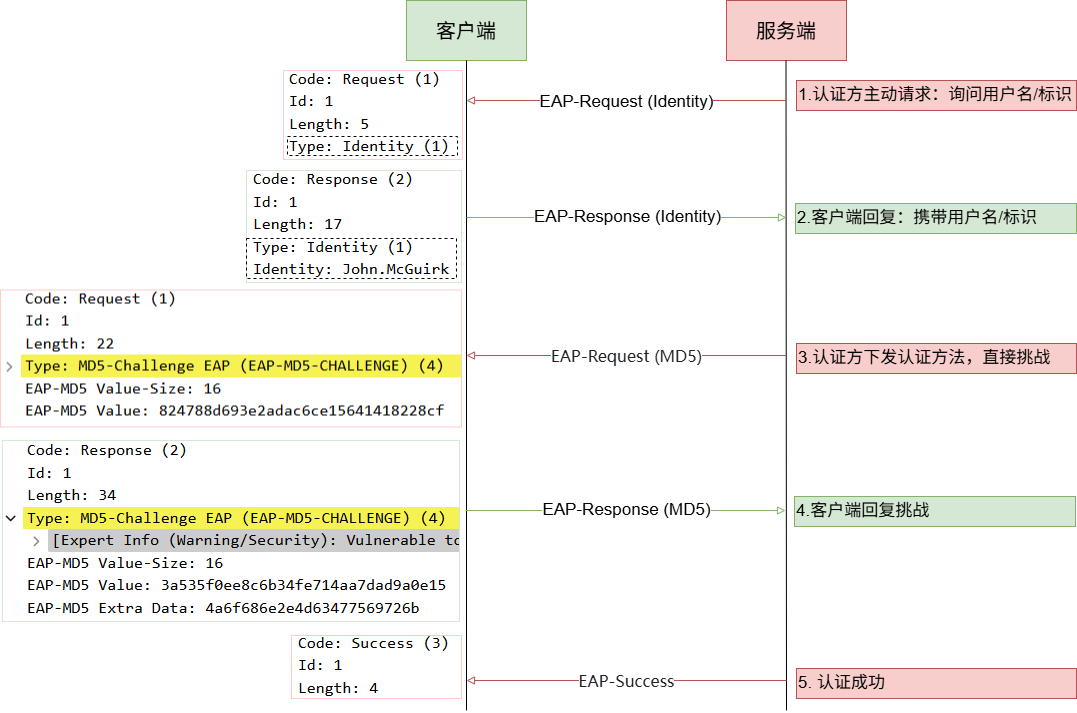 EAP 中继模式,基于 EAP-MD5 认证流程如下: