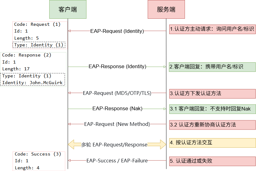 EAP-Request/EAP-Response交互,完成凭证校验。 - 认证结束 。认证方最终发送