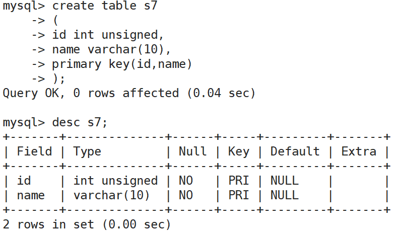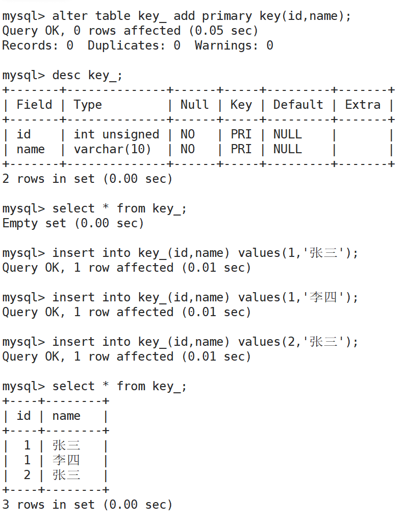 当表创建好以后,但是没有主键的时候,可以再次追加复合主键,