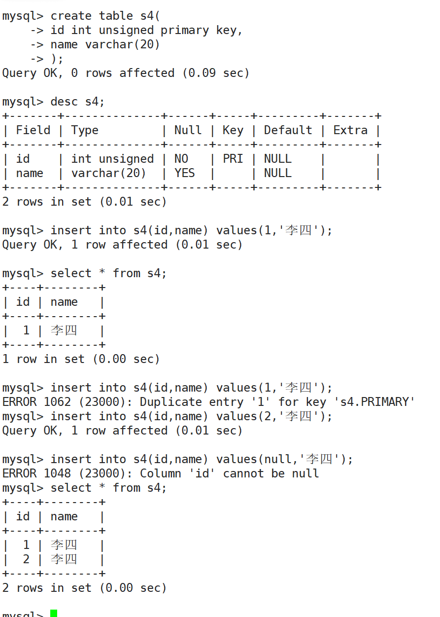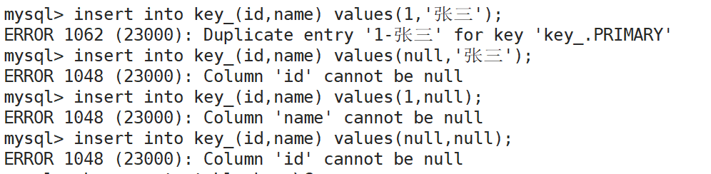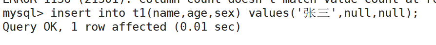 插入null:报错,设置了not null属性,就不能插入null