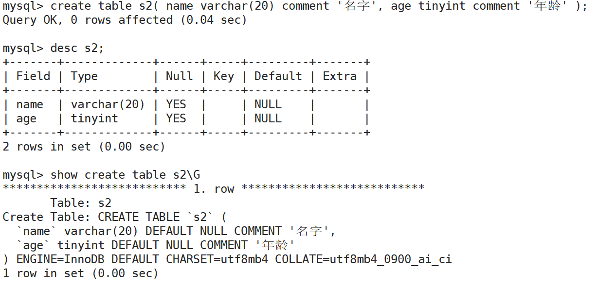 comment,没有实际含义,专门用来描述字段,会根据表创建语句保存,用来给程序员来进行了解,这样就降低了insert出错的概率