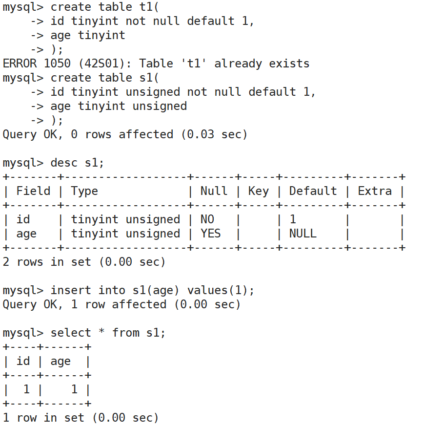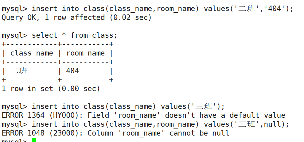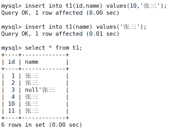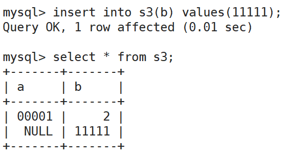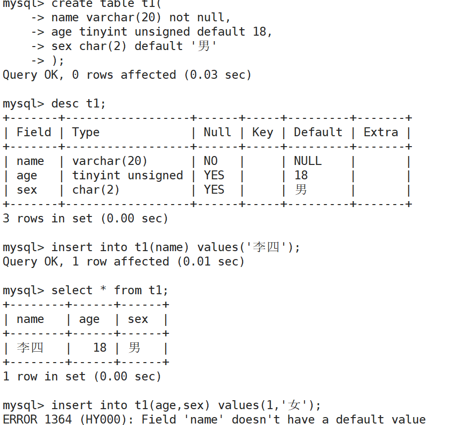 如果我们没有明确哪一列要插入,用的是default默认值,如果建表中,对应列默认没有设置default,无法省略那一列的插入
