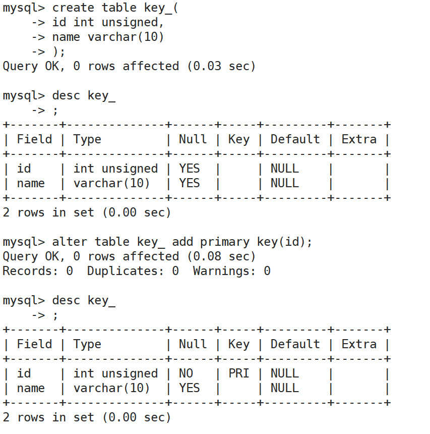 当表创建好以后但是没有主键的时候,可以再次追加主键,有了主键就不能追加了,一旦追加报错