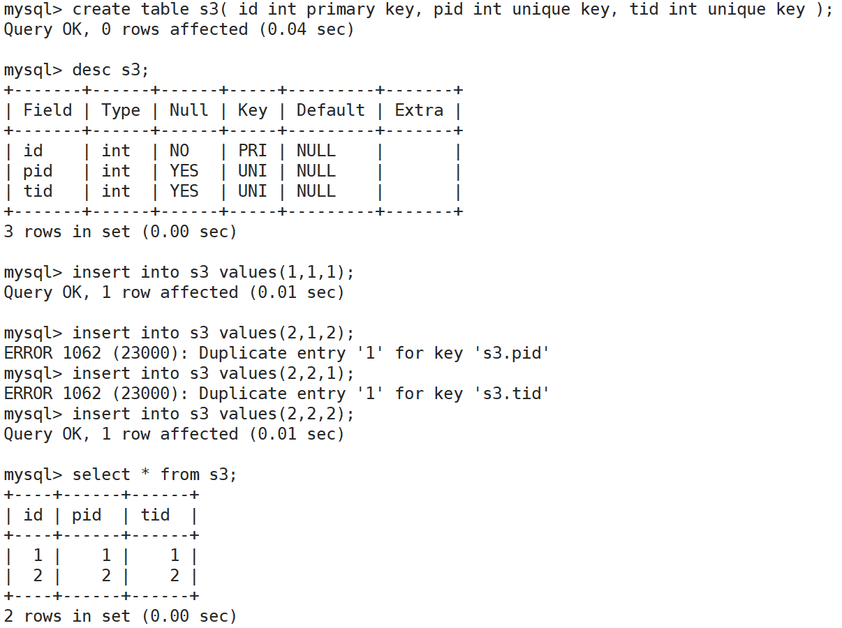 可以插入null,不能重复,可以设置多列,每一个设置unique key的列,都不能重复,主键只有一个,复合主键是多列共享一个主键,只要多列不完全一样就行,而唯一键每一列都不能重复