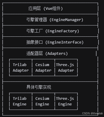 真实政企项目基本全程只用一个地图引擎,很少动态切换。所以我放弃工厂模式,改用最简单的适配器封装:业务统一调用trilabEngine.addLayer,适配Trilab就写EngineMap,后续要接Cesium,直接新建EngineMapCesium就行。上层业务代码不用动,调用链路最短、性能更好,也是国内很多GIS公司通用的简洁方案,拒绝过度设计。