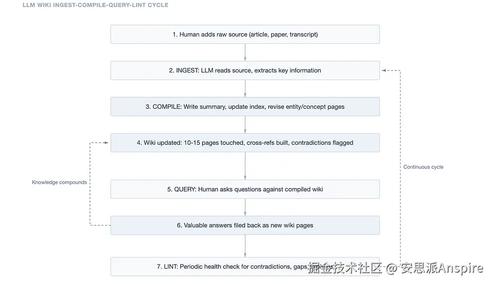 卡帕西的见解简洁而精妙:如果大语言模型在查询时不检索原始文档会怎样? 如果它已经读完了所有内容,提取了关键信息,将其整理成一个带有交叉引用和实体页面的结构化维基,并持续更新整个内容,那又会怎样呢?
