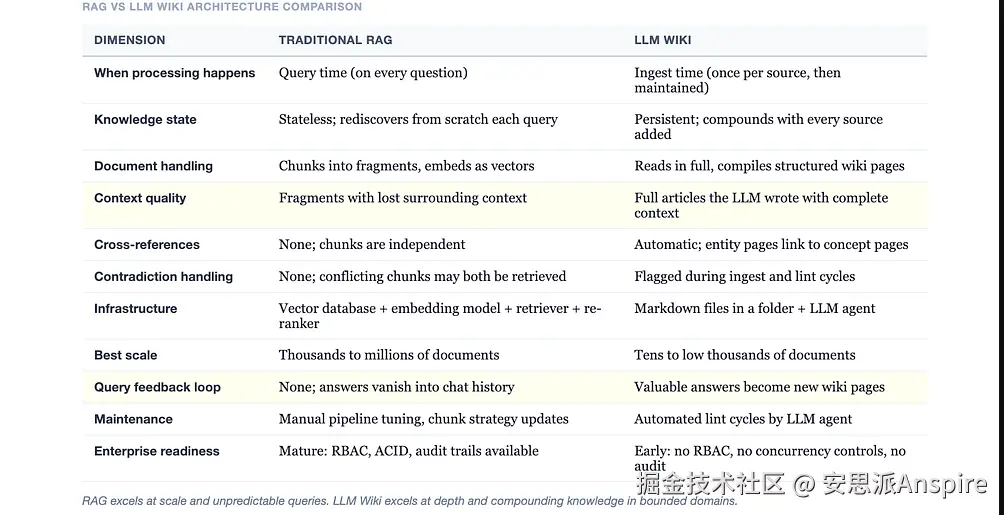 但这种批评是有道理的。对于个人知识库、研究项目、小团队维基以及规模在数百到数千份文档的特定领域知识管理来说呢? 大语言模型维基模式明显更优。