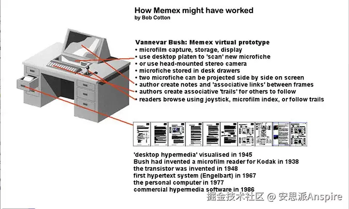 卡帕西明确引用了万尼瓦尔·布什1945年提出的麦克斯存储器(Memex)。对于不了解的人来说,布什是二战期间美国科学研究与发展办公室的主任,他写了一篇具有前瞻性的文章《诚如我们所想》("As We May Think"),这篇文章实际上描述了现代互联网、个人知识管理和超链接信息系统; 在网络出现前50年。