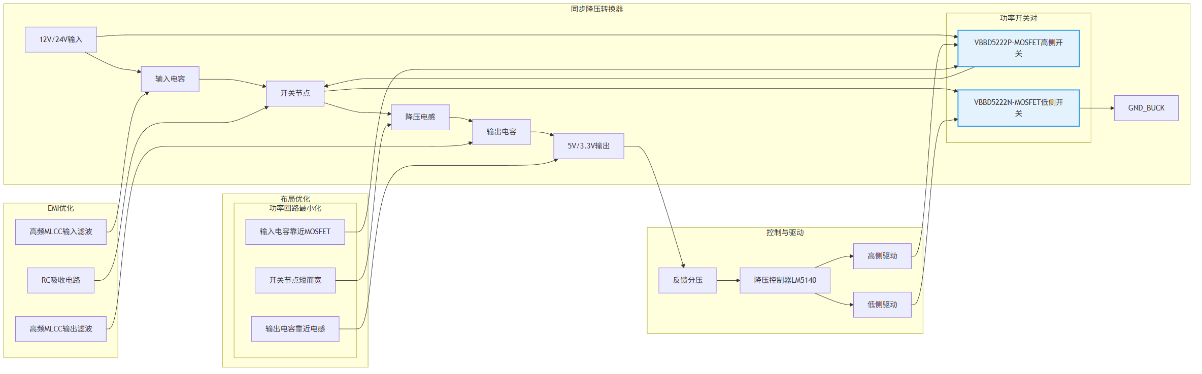 VBBD5222:需搭配支持同步整流的降压控制器(如LM5140)。注意高侧P-MOSFET和低侧N-MOSFET的驱动时序与死区时间设置。