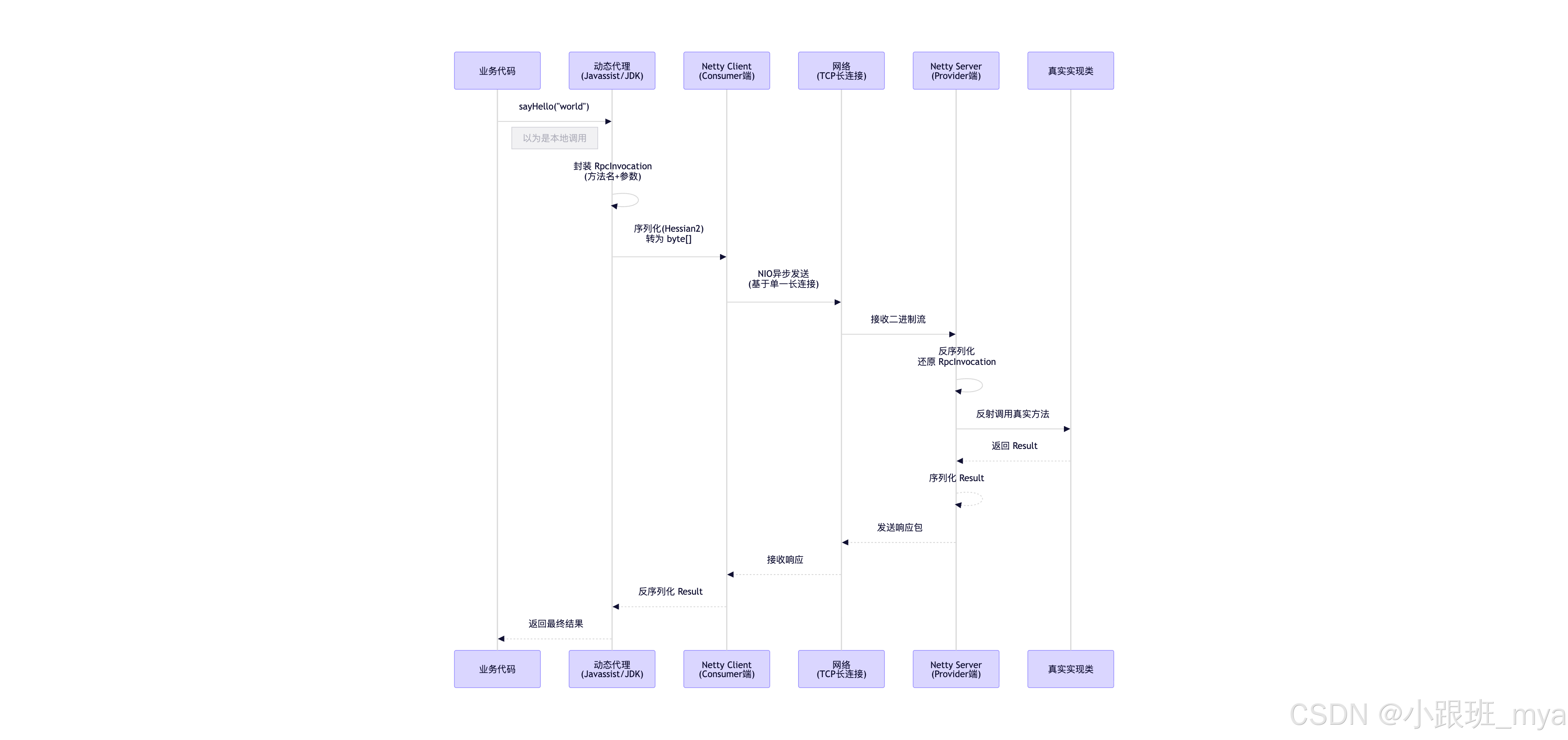 sayHello("world"),得到结果。 - 响应:将结果再次序列化,通过 Netty 原路发回给 Consumer。