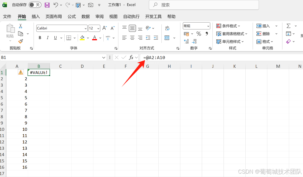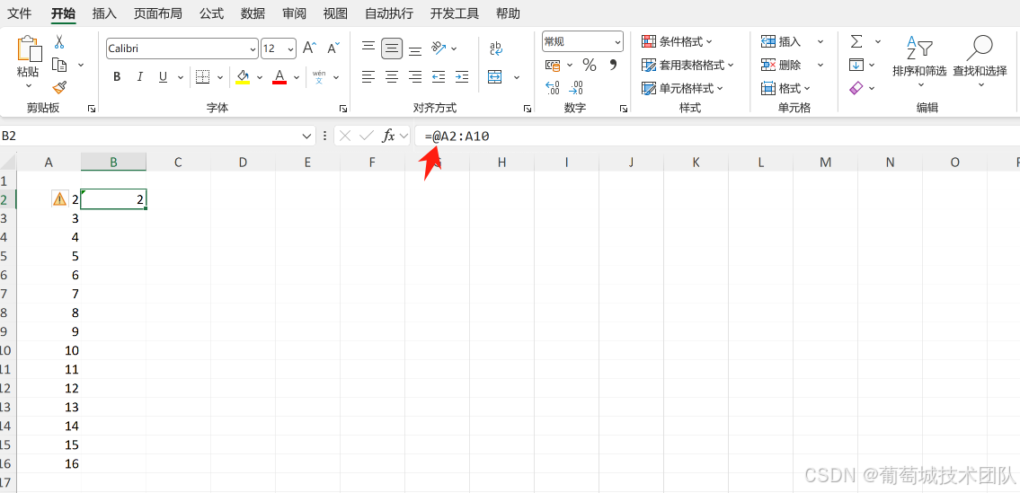 注意: 如果你在 B1 单元格输入 =@A2:A11,由于第 1 行与 A2:A11 没有交集,Excel 通常会返回该区域的第一个值(即 A2),或者在某些复杂引用下返回 #VALUE!。