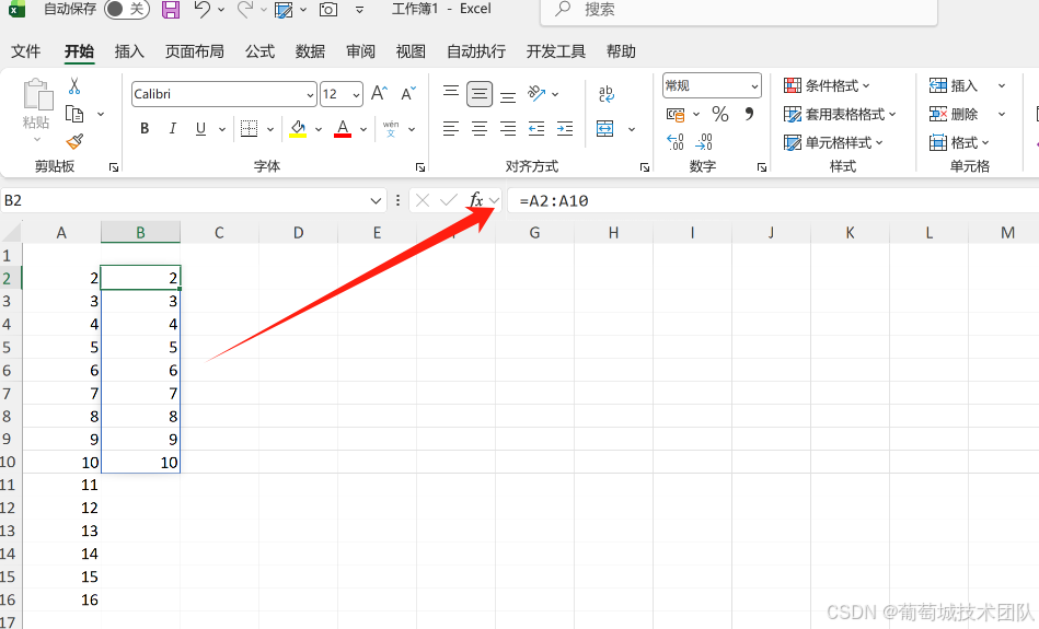 =A2:A11- 结果: B2 到 B11 会自动填满 A 列的数据(溢出)。