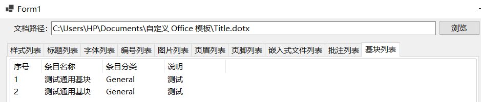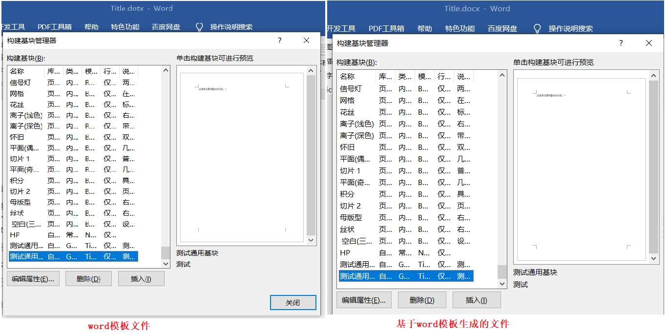 下面的示例代码用于向word模板文件写入基块信息。虽然也能向word文档中写入基块信息,但在word文档的构建基块管理器中看不到插入的数据,向word模板中写入基块信息,再基于模板生成word文档,这样在模板和word文件的构建基块管理器内都能看到插入的数据,如下面截图所示: