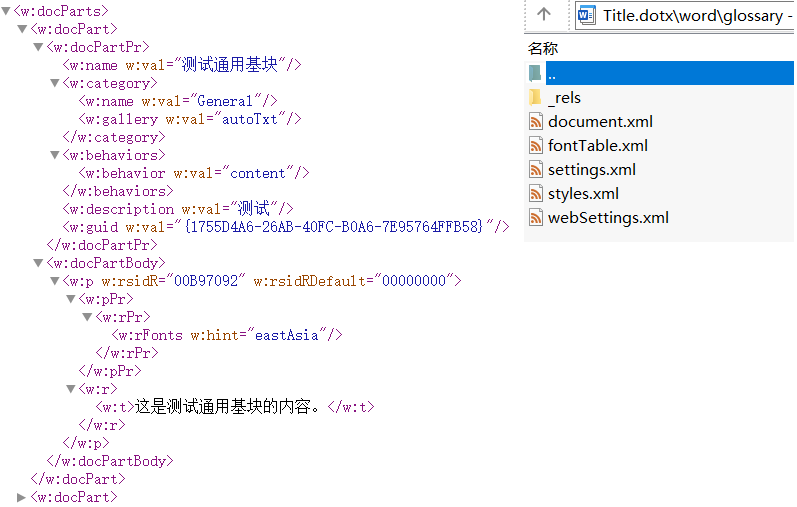 OpenXml中使用GlossaryDocumentPart类集中管理Word文档中所有的文档构建基块内容,适合用来存储合同中的可选条款、信函中的标准段落、公司信头或签名等各类需要重复使用的内容。采用解压缩软件打开Word模板文档(word文档中没有找到在哪里),其内的word\glossary文件夹中的document.xml文件保存通过程序插入的基块内容,如下图所示。