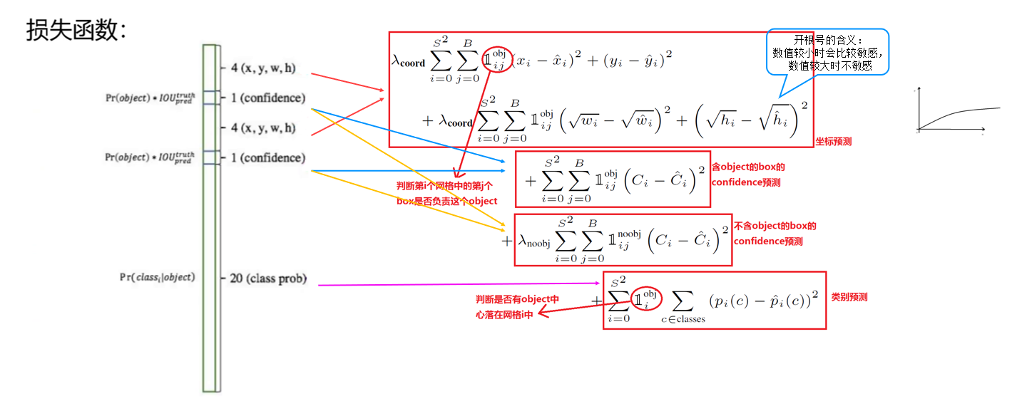 - 坐标损失 :分为中心坐标(x,y)损失和宽高(w,h)损失;宽高取平方根后计算误差,解决 "相同误差对小目标影响更大" 的问题。