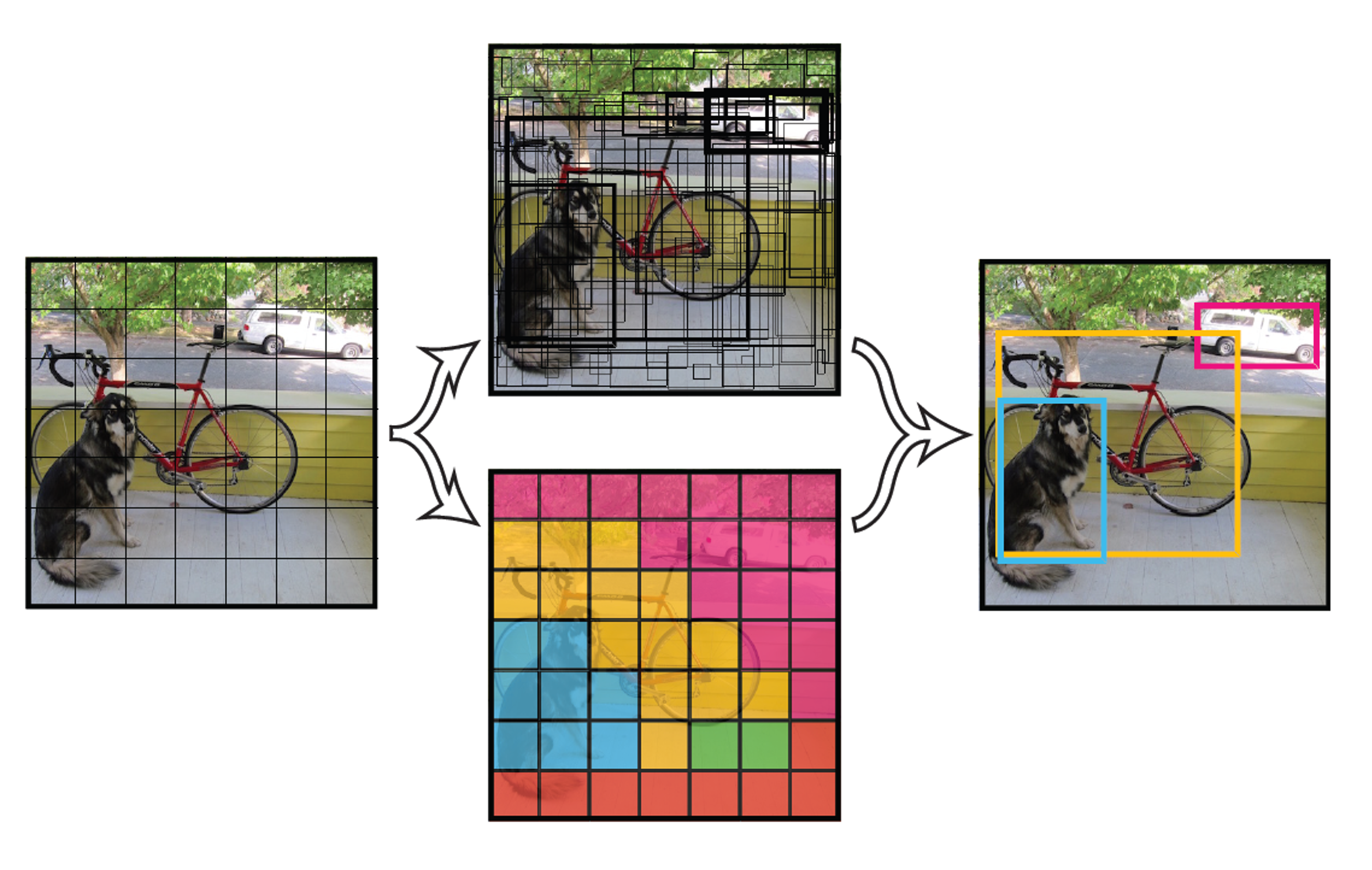 小狗的中心点落在黄色网格内,因此该网格负责预测小狗;右图中,自行车的中心点落在对应网格,由该网格负责预测。这种 "中心归属" 机制简化了检测任务的复杂度。