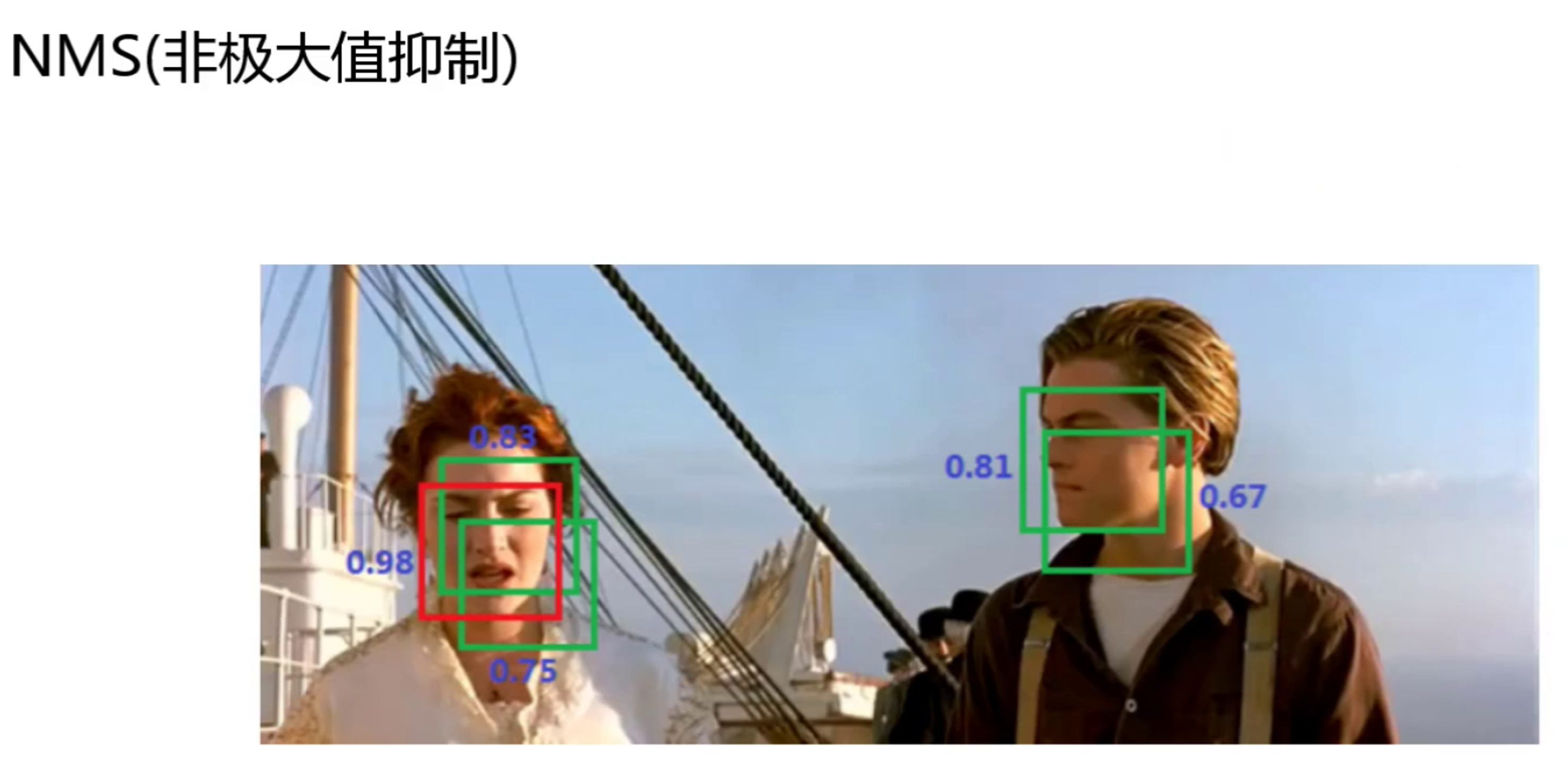 图中同一人物出现多个重叠框,经 NMS 处理后,仅保留置信度最高的框(如人物面部置信度 0.98),去除冗余框,保证检测结果的简洁性。