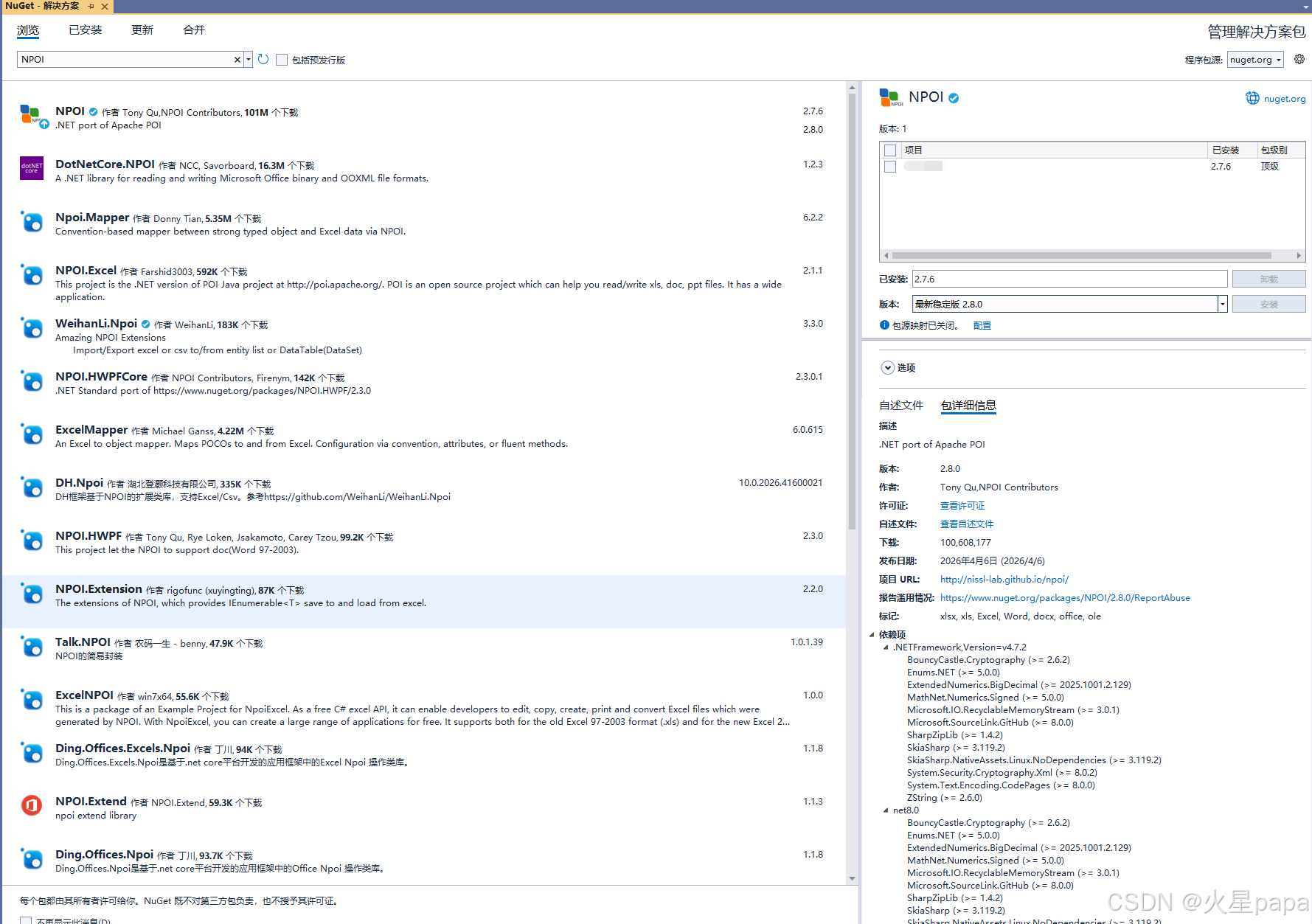 在浏览中搜索"NPOI",可以找到人气最旺的NPIO,可以安装最新版本,点击安装即可。我这里安装了稳定版本2.7.6,已确认该版本可以使用。