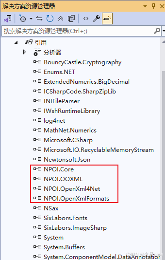 在工程解决方案资源管理器的引用中也可以看到添加的NPOI项目。