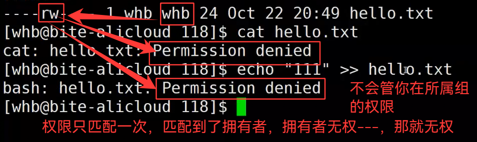 如果你是拥有者,并且是所属组,但是你拥有者权限是 --- ,即便你所属组是rwx,你也无法执行任何操作
