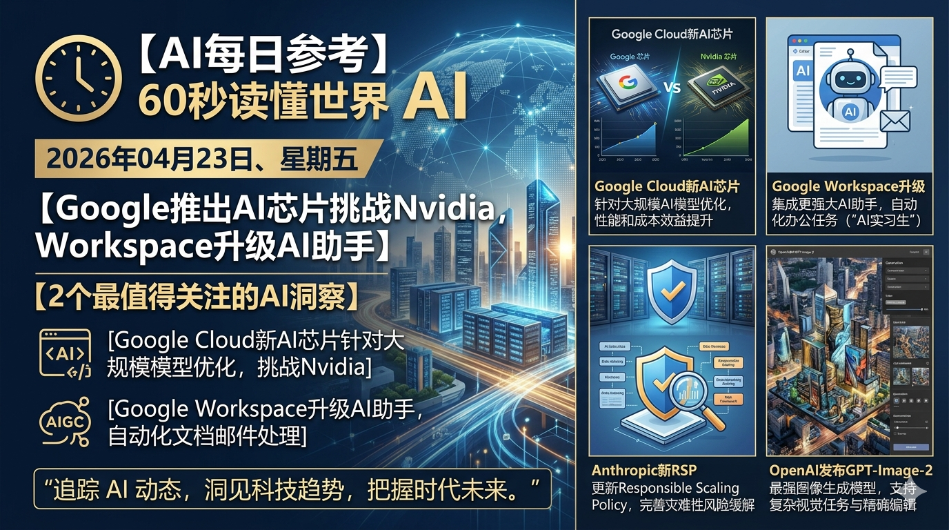 今天AI圈有两件值得关注的事。其一,Google Cloud推出新一代AI芯片与Nvidia竞争,标志着AI芯片市场竞争加剧;其二,Google Workspace升级AI功能,让AI成为办公室"实习生",AI应用进入企业办公核心。10条精选资讯,带你快速掌握今日AI动态。