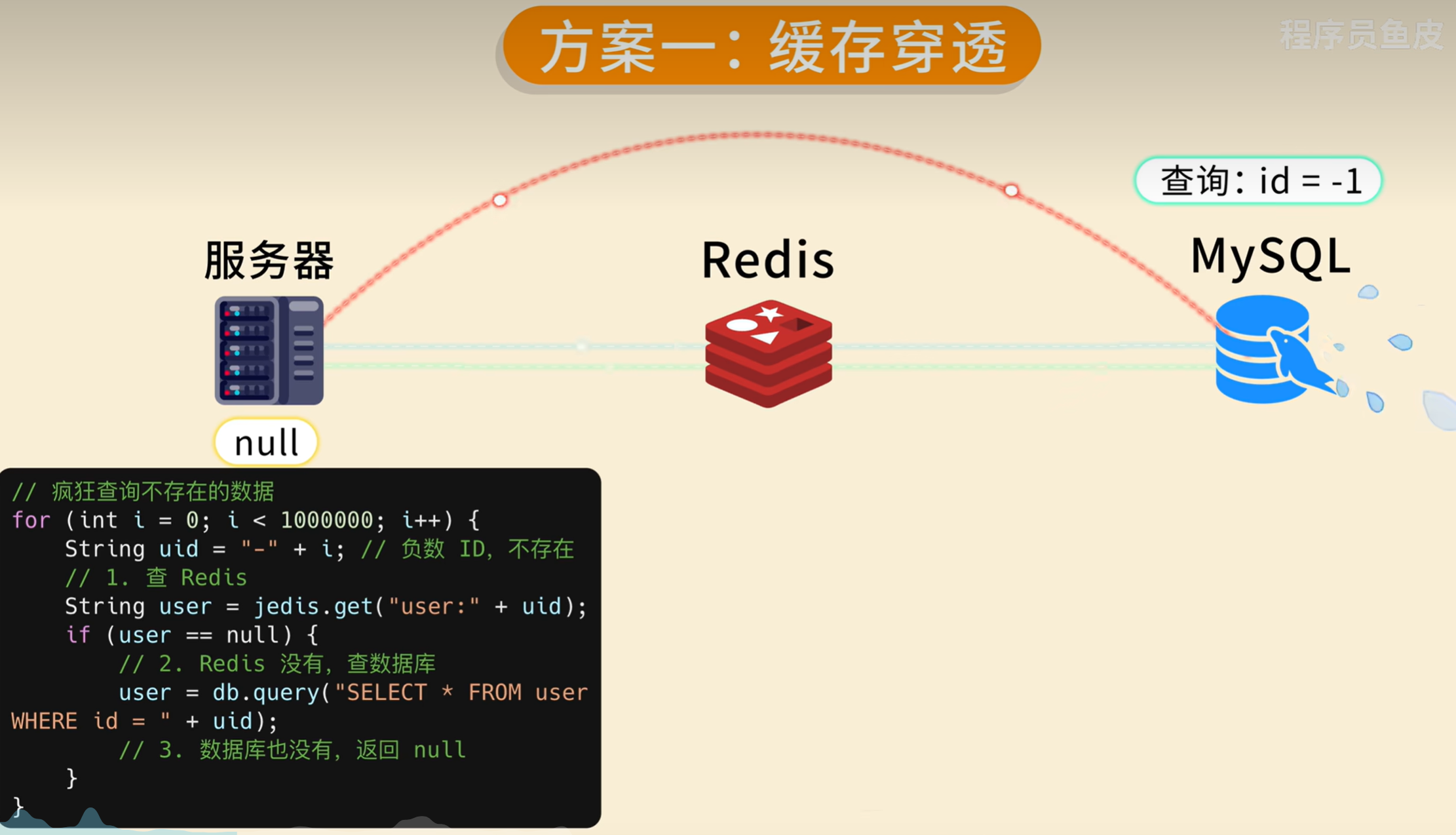 用户大量查询数据库和缓存中都不存在的数据,比如 id 为 - 1、或者不存在的商品 id,导致每次请求都绕过 Redis,直接查询数据库。