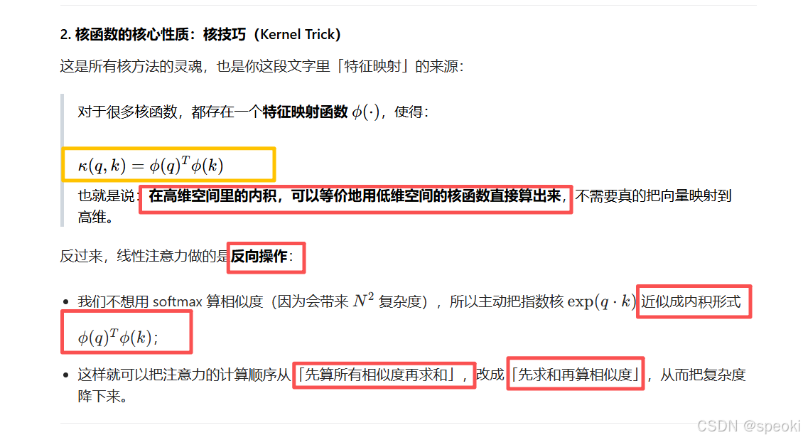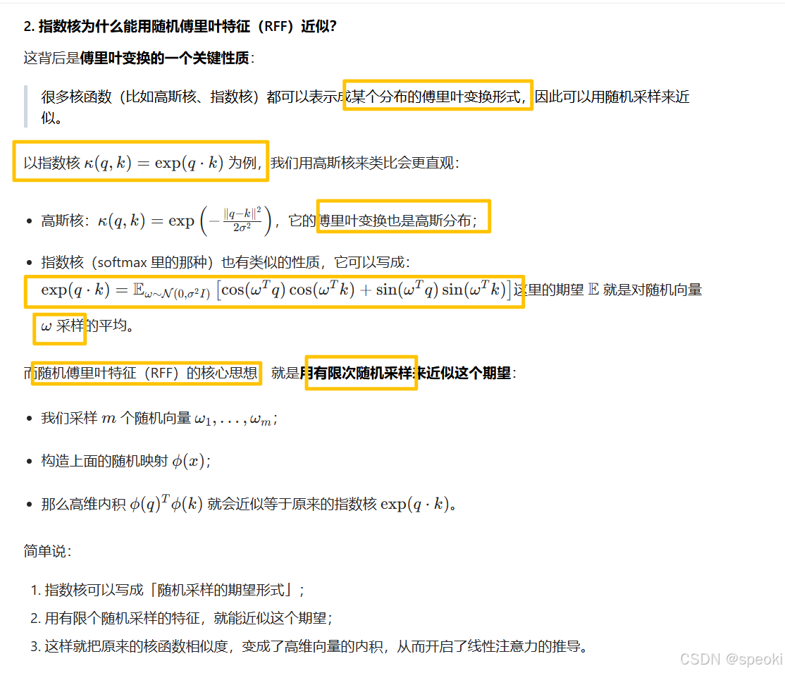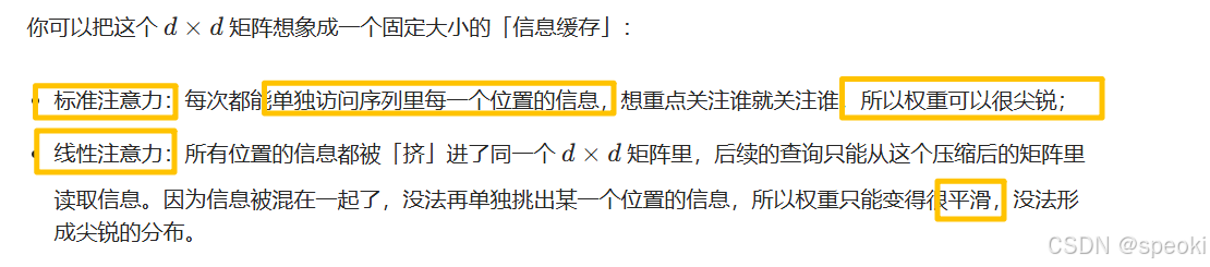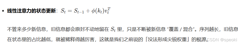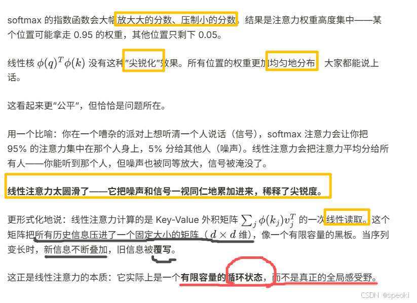 这听起来很完美。但线性注意力在实践中一直不如标准注意力------尤其是在需要精确、尖锐的注意力时(比如指代消解、关键词匹配)。原因是:softmax天然地产生尖锐的分布,线性核不能。