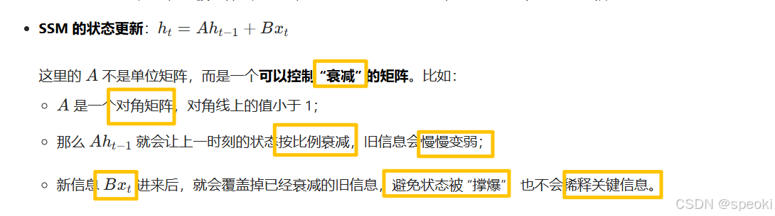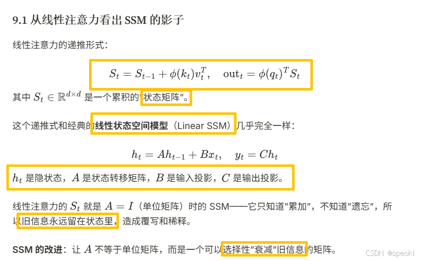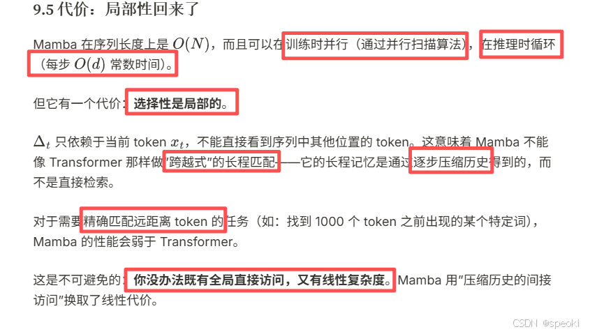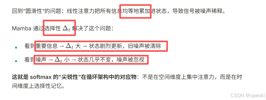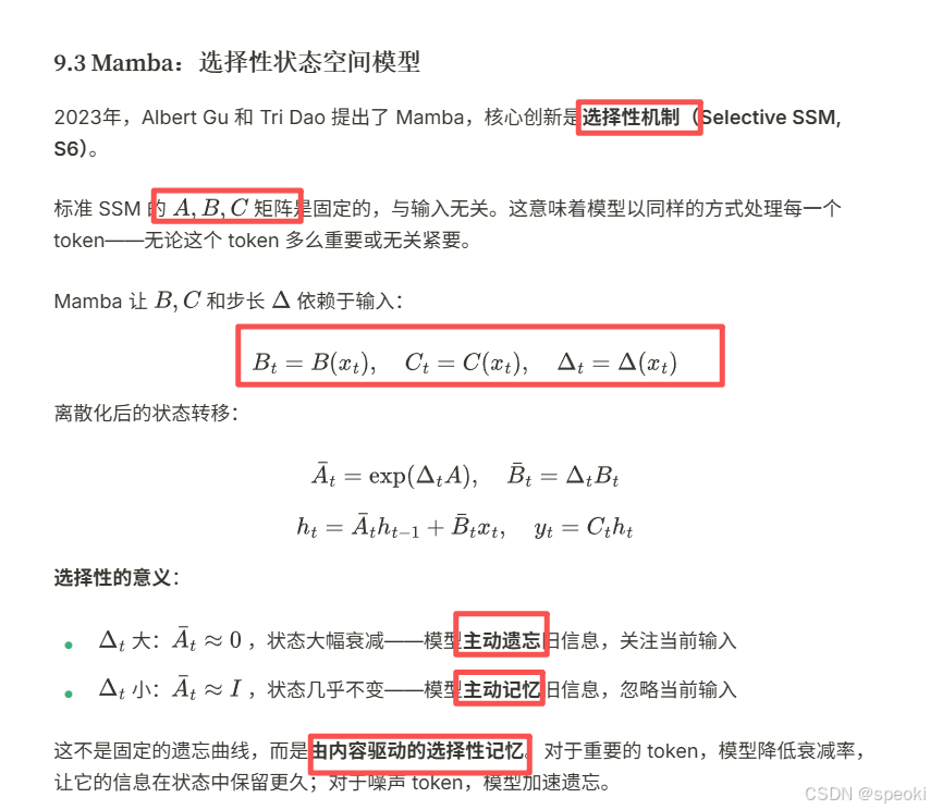 线性注意力 的分析揭示了一个更深的问题:全局感受野和线性复杂度 ,能否同时拥有?答案是:不能------除非引入一个新的维度:选择性。这就是状态空间模型(SSM)以及 Mamba 的核心思想。