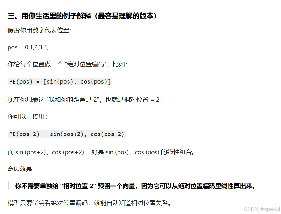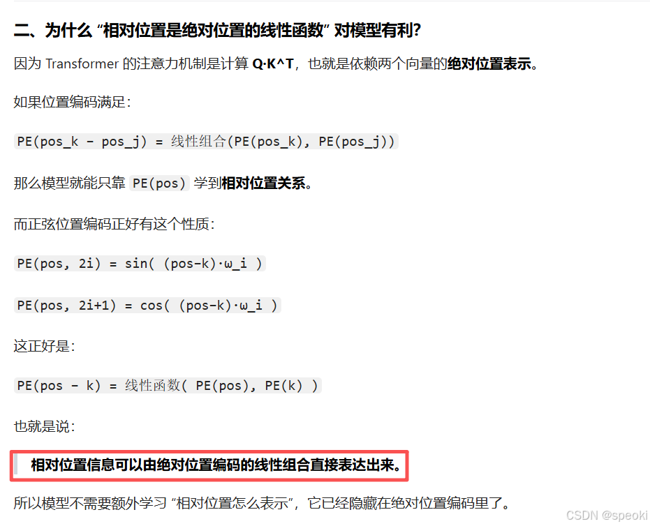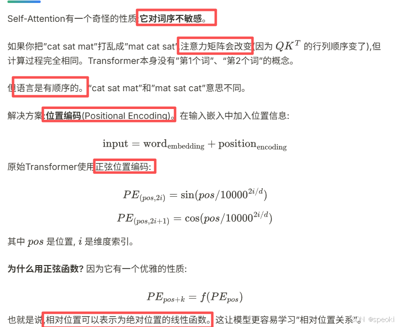 正弦位置编码是一种绝对位置编码方法 ,其编码是确定性的且不包含可学习参数 ,因此不会引入额外的学习噪声,然而由于这个编码方法通过与【token embedding 相加的方式 】注入的,这样token表示中的内容信息与绝对位置信息是强耦合的 ,从而在注意力计算中难以被显式解耦 。其局限在于------并未显式建模token之间的相对位置关系 ,模型需要通过绝对位置编码间接推导这些关系,从而增加了学习负担。