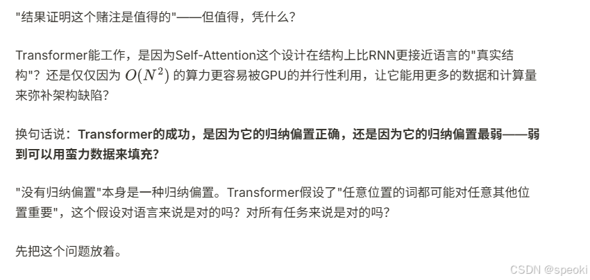 "没有归纳偏置"本身是一种归纳偏置。Transformer假设了*"任意位置的词都可能对任意其他位置重要"*,这个假设对语言来说是对的吗?对所有任务来说是对的吗?