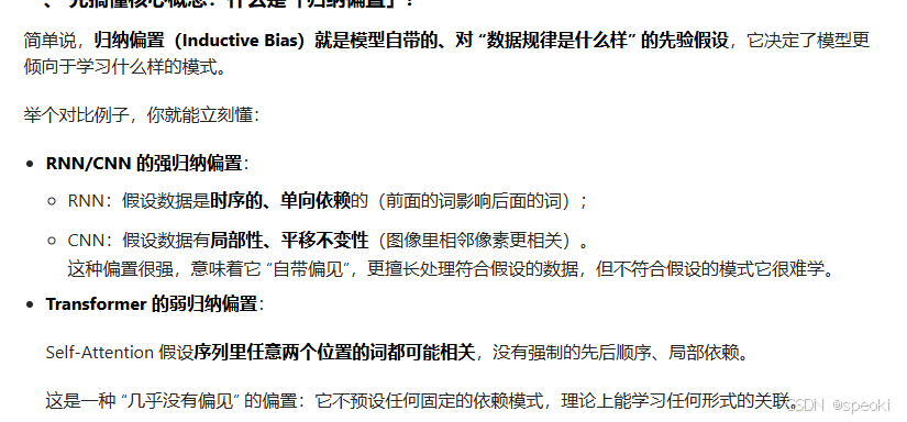 **归纳偏置(Inductive Bias)**就是模型自带的、对 "数据规律是什么样" 的先验假设,它决定了模型更倾向于学习什么样的模式。