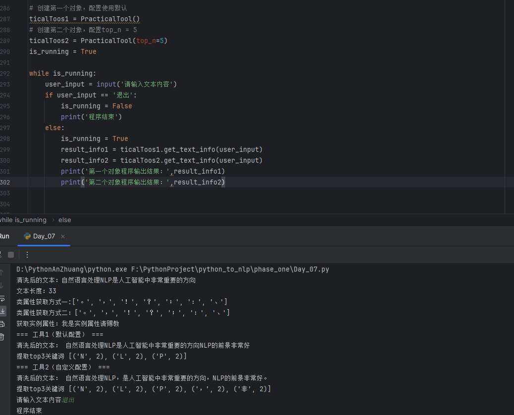 调用方式:对象名.方法名(参数),比如上面的tool.clean_text(text)就是调用实例方法。