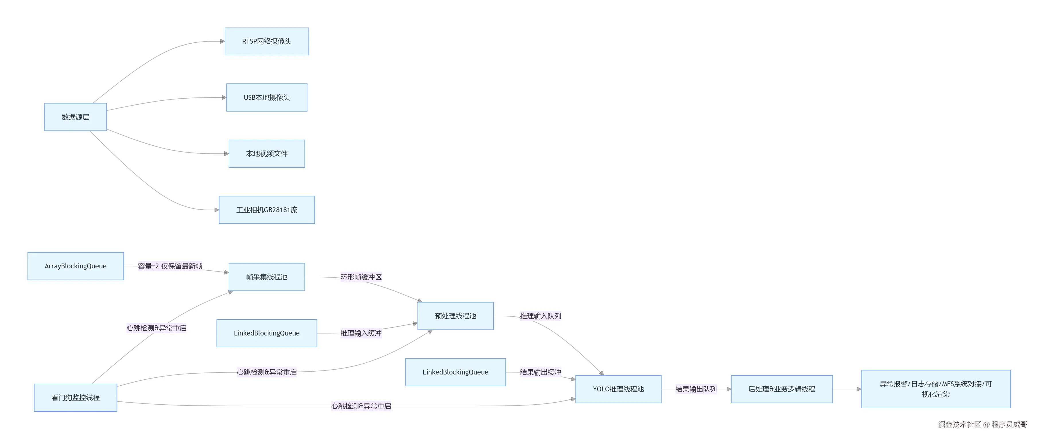 ThreadPoolExecutor实现自定义线程池,可根据服务器CPU核心数、GPU算力灵活调整线程数,最大化硬件利用率 - 生产级容错:独立看门狗线程监控各环节线程状态,出现卡死、异常时自动重启,保证7*24小时稳定运行