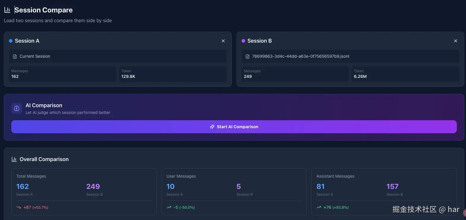 选两个 session,直接对比 message 数量、token 消耗、工具调用次数、模型版本......同一个任务,换了 prompt 或换了模型,差异一目了然。