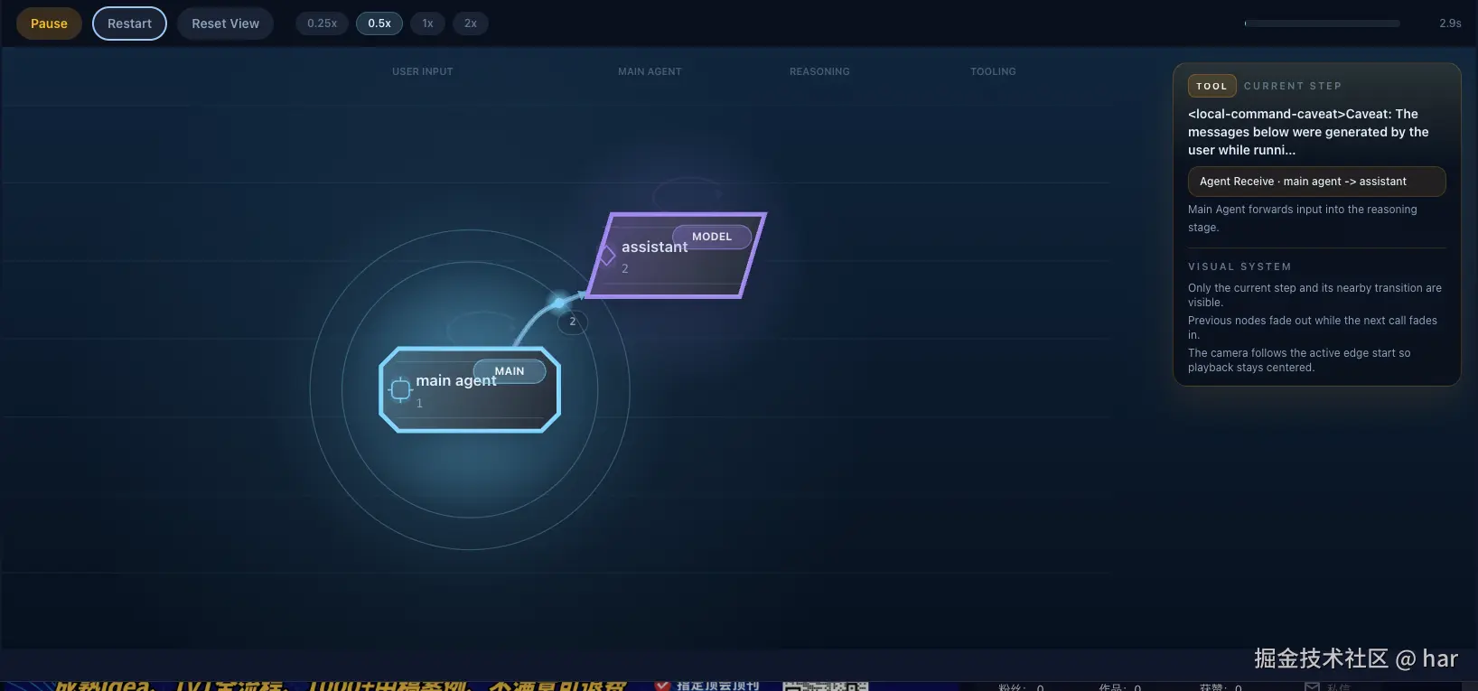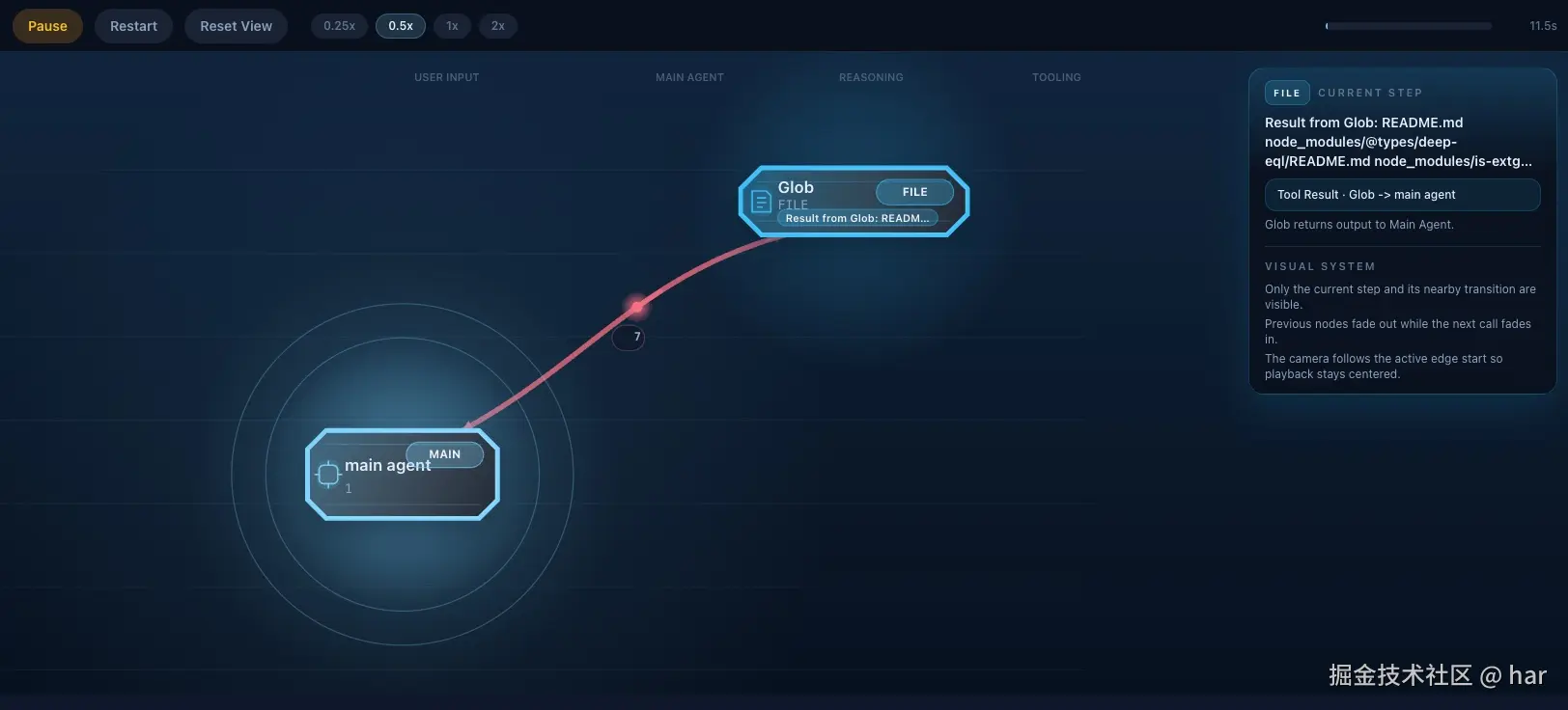 这是最直观的功能:把 session 里 user → agent → tool → assistant 的整个协作链路,以动画形式一步步回放出来。