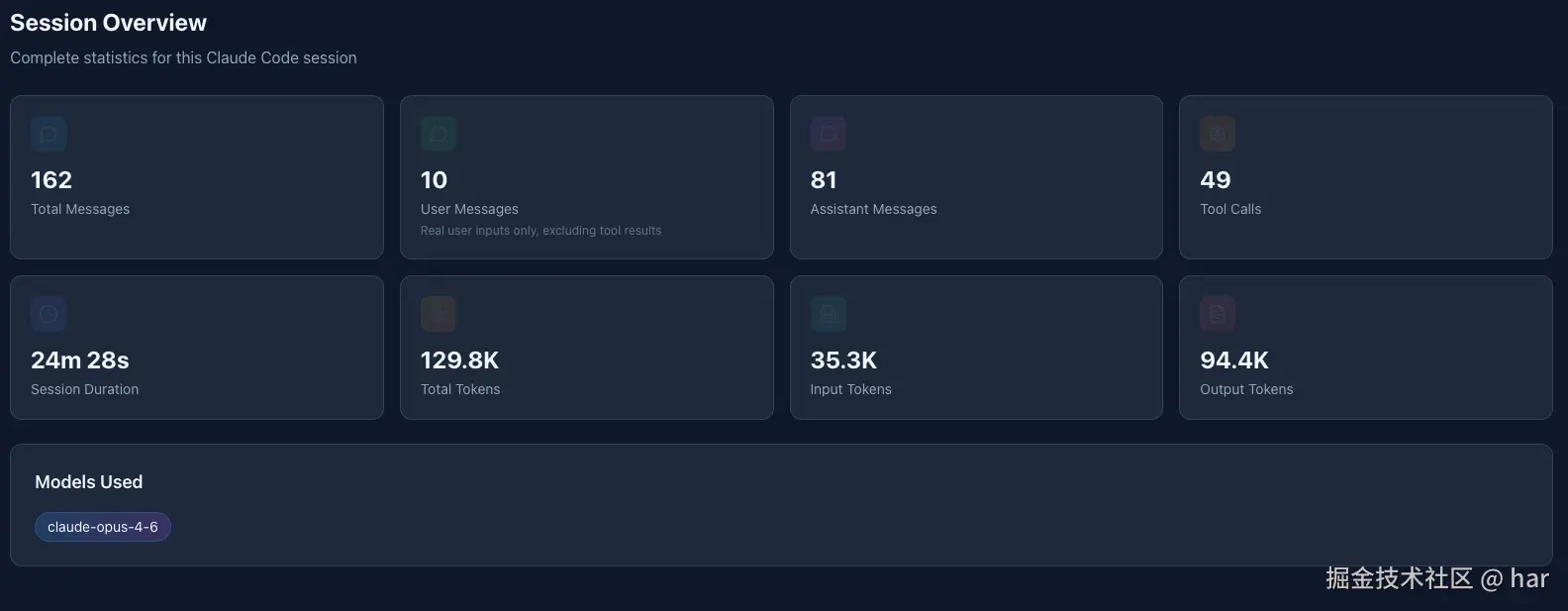 | Session Overview | Token、消息数、模型、耗时、工具使用的全局概览 |