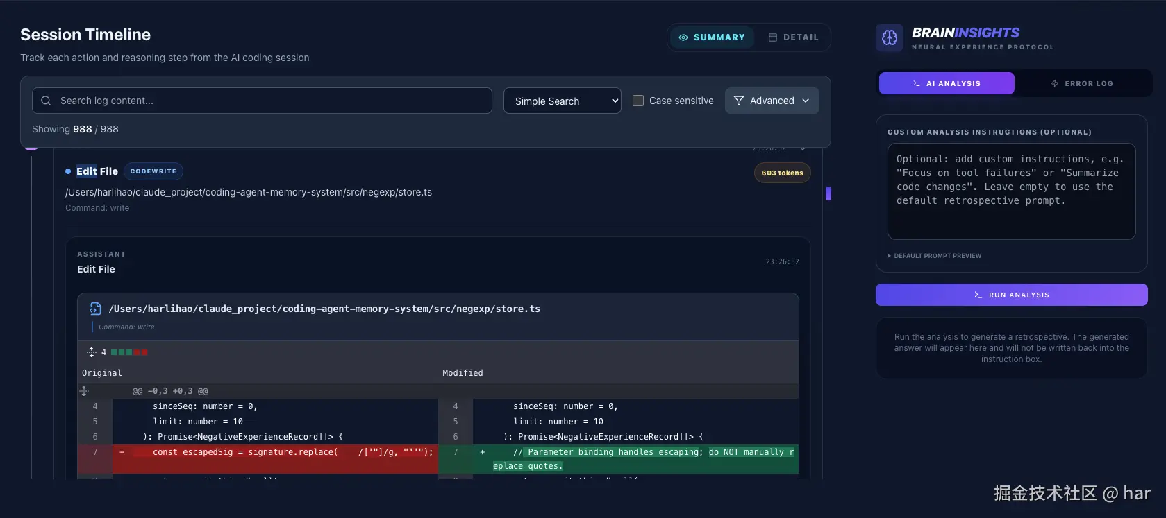 Session Timeline:所有事件按时间轴排列,工具调用、diff、文件读写一目了然