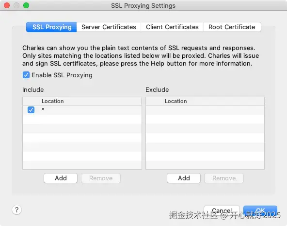 - 获取证书:在浏览器访问"chls.pro/ssl" 下载证书,并在 Proxy->SSL Proxying Settings->SSL Proxying,在 Include 中点击 Add,并在 host 处填写*,同时点击 Enable SSL Proxying。然后选择 OK: