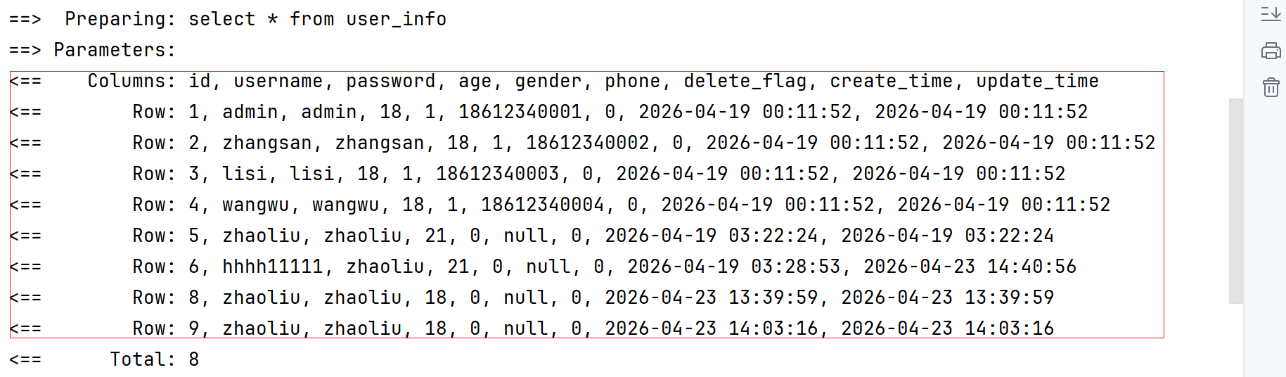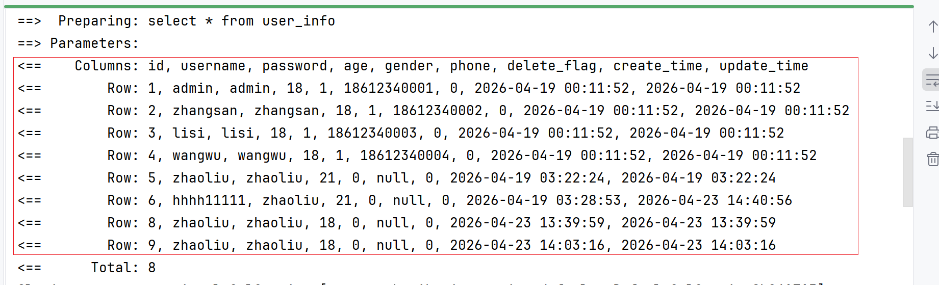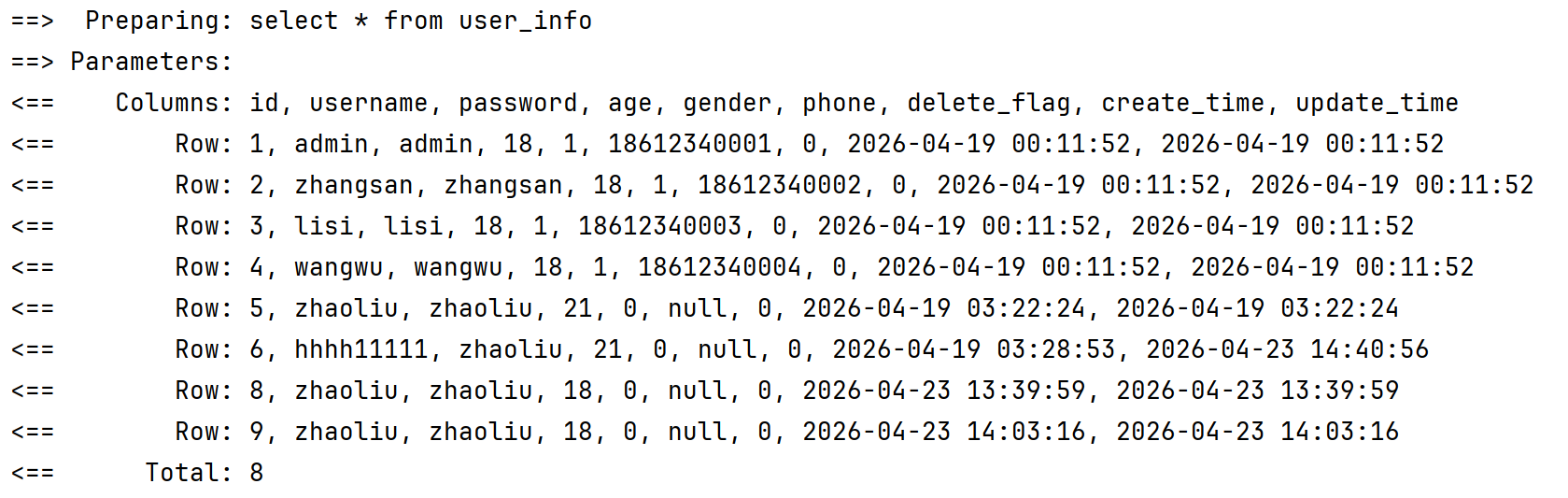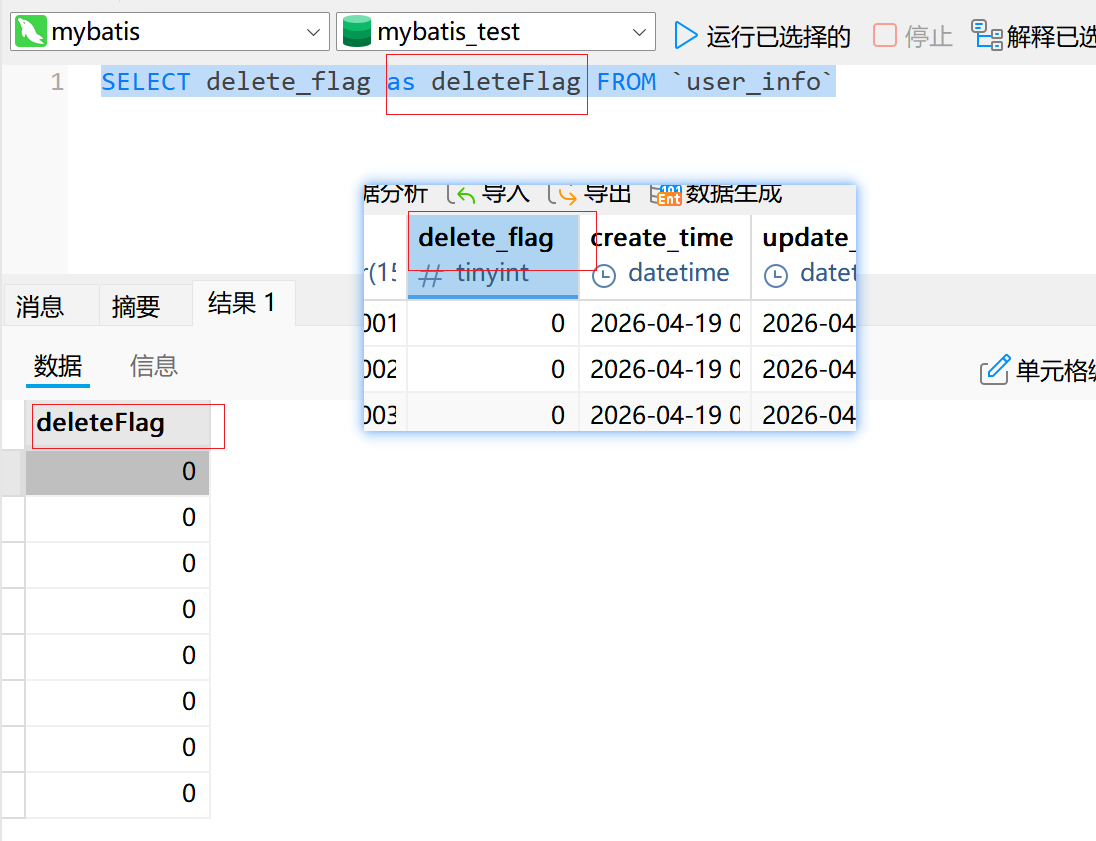 发现没,就拿user_info表的delete_flag字段和UserInfo对象的deleteFlag属性来讲吧,它们名字都不一样,你还指望我们mybatis啥也给你弄好,那它是不是太牛马了,你想是吧,这背后是不是存在一种映射关系呢?我想是有的,所以这就是返回结果有点问题的原因!