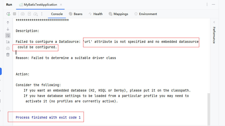 启动完之后,发现启动失败了,原因不在于我们的sql语句的问题,也不在我们写的代码的问题,原因就在于我们没告诉spring,要连接哪个数据库,而不是sql语句里一句简单的我要查询这张表,所以我们前面创建springboot工程,并导入mybatis的起步依赖,mysql的驱动包,但还不够,还要告诉spring我们这个sql语句连接的是mysql里的哪个数据库!