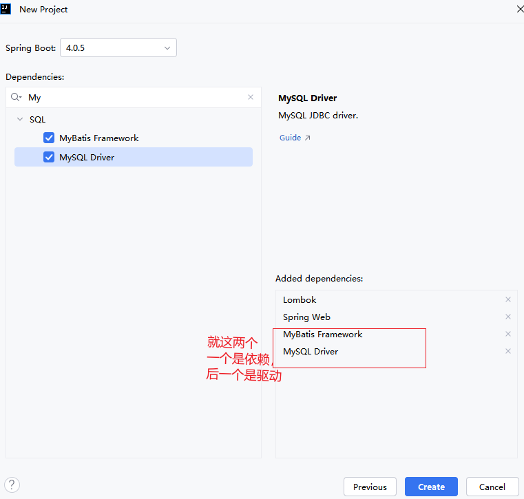 自动导入了mysql驱动包,和下面的mybatis依赖包。