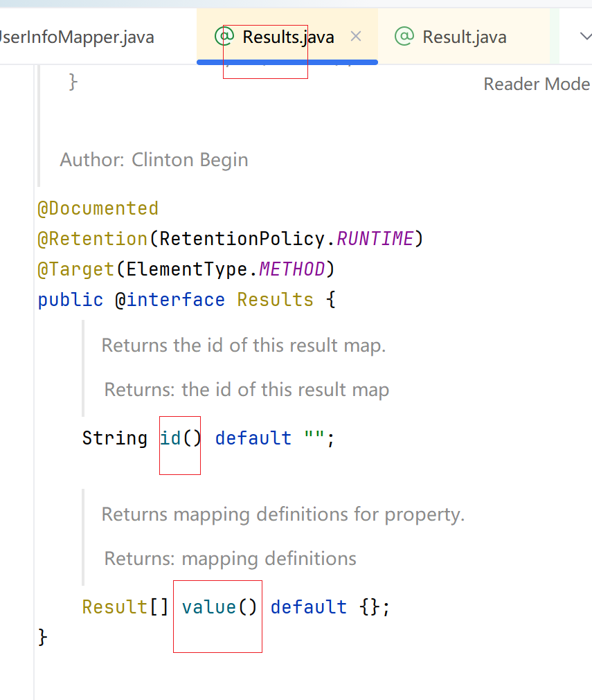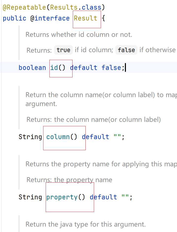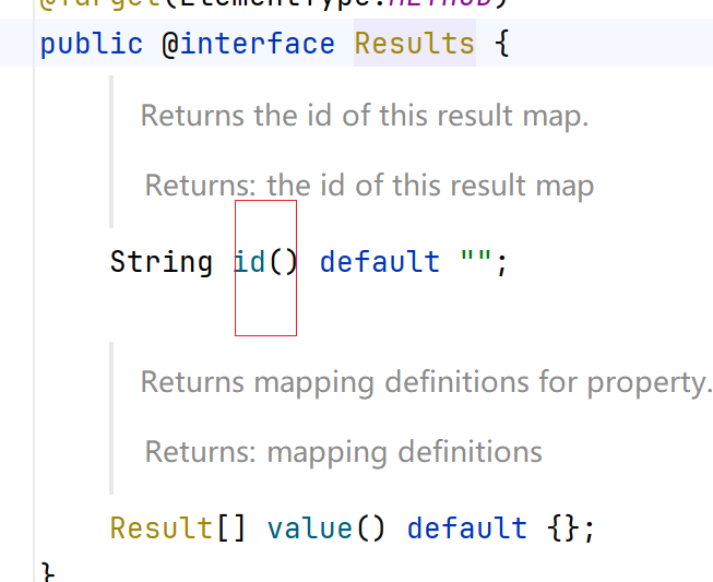 两个属性,一个id,一个@Result的注解数组,再ctrl点击@Result注解,进来