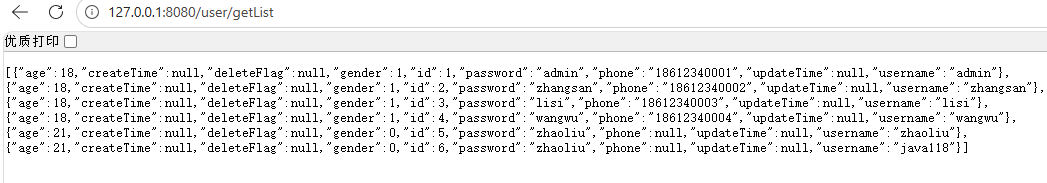 和我们上面的通过URL访问返回的结果一样。但是我觉得,这个返回结果和我们的spring测试用例启动的打印信息黏在了一起,看起来不够清晰。