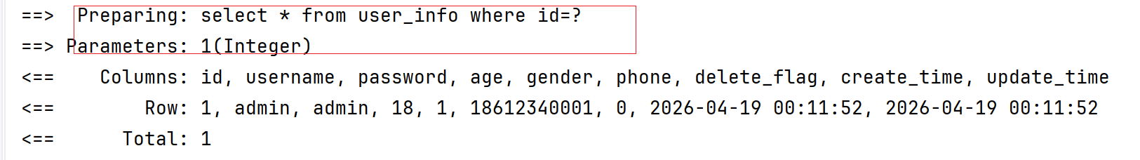 可是我想啊,假如占位的那个#{id}我改成#{id1}呢,反正只有一个参数,就算id1和id匹配不上,我们的mybatis和spring难道不会给我们进行优化嘛,验证一下,