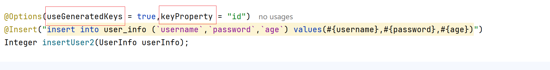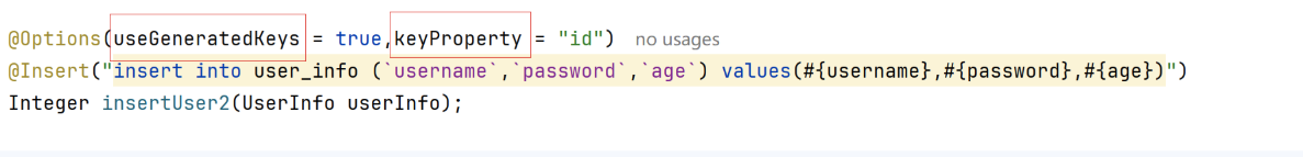这个@Options注解,keyProperty参数,是要从你插入成功之后,拿到你刚插入的字段值,userGneratedKeys参数呢,它为true代表数据库里id字段是个自增的,必须是个自增的字段,为false,代表你自己在查数据库之前,已经设置了id属性,可是一般不这么做,一般设为true。