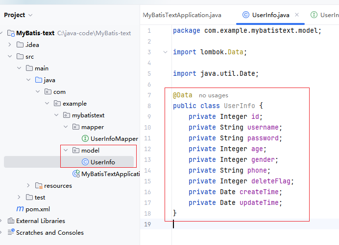 这个包名为啥叫model呢,这其实一种"名字约定",表示这个包底下的类都是实体类,当然你不想这么写,也可以写成其他的,都是ok。