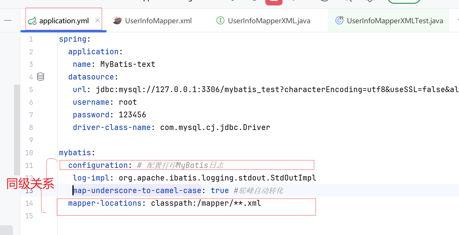 在yml文件里添加mybatis连接mybatis_test数据库的相关操作