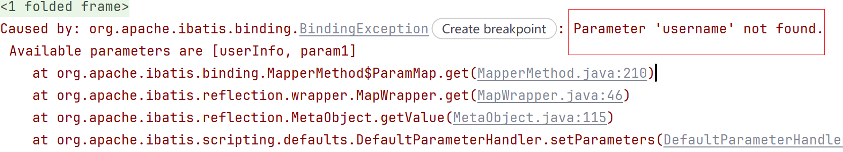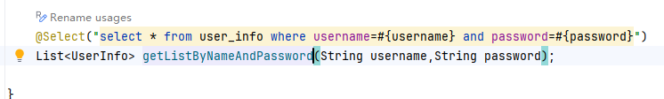 结果发现,报错了,是我们传递的username没找到,所以我们有理由怀疑,@Param注解加完之后,#{}这种写法取值不到,然后我们只改一下接口写法,